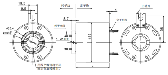 緊定螺絲固定。定子部分通過(guò)止轉(zhuǎn)片與設(shè)備固定部位連接。